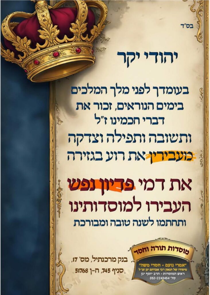 זכו במצווה! פתחו את לבכם ותמכו. כל תרומה היא חסד אמיתי ופותחת שערי ברכה. יחד נוכל לסייע לאחינו הזקוקים לעזרה ולהאיר להם את הדרך.לחצו כאן לתרומה נדרים לחצו כאן